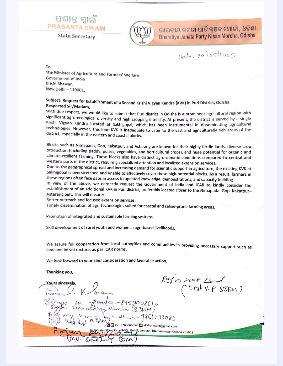 ଏହି ସମ୍ବନ୍ଧରେ ବିଜେପି କୃଷକ ମୋର୍ଚ୍ଚା ରାଜ୍ୟ ସମ୍ପାଦକ ପ୍ରଶାନ୍ତ ସ୍ୱାଇଁ, ରାଜ୍ୟ କାର୍ଯ୍ୟକାରିଣୀ ସଦସ୍ୟ ବିଜୟ ପଣ୍ଡା, ଜିଲ୍ଲା କୃଷକ ମୋର୍ଚ୍ଚା ସଭାପତି ଅଜୟ ପ୍ରଧାନ, ଉପସଭାପତି ରଞ୍ଜନ ବରାଳ ଓ ଅର୍ଜୁନ ବରାଳ ସହିତ କୃଷକ ସମୂହ କୃଷି ମନ୍ତ୍ରଣାଳୟ, ଭାରତ ସରକାର ଏବଂ ଆଇ.ସି.ଏ.ଆର୍. କୁ ଚିଠି ଲେଖି ପୁରୀରେ ଦ୍ୱିତୀୟ କୃଷି ବିଜ୍ଞାନ କେନ୍ଦ୍ର ସ୍ଥାପନ ପାଇଁ ଅନୁରୋଧ କରିଛନ୍ତି।